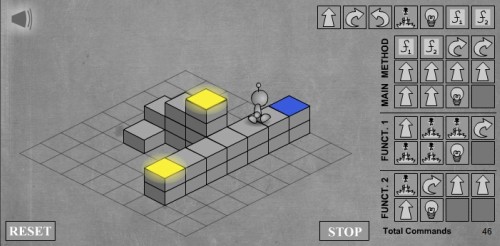Quisiera compartir con ustedes este pequeño jueguito flash con el cual me estuve divirtiendo un rato. Lo que hay que hacer es «programar» un simpático robot, para que se mueva en un tablero con obstáculos de tal forma que cumpla en cada nivel una determinada tarea. Para programarlo contamos con instrucciones básicas como avanzar un casillero o girar y además, dos funciones f1 y f2. Es interesante porque hay que aplicar varios conceptos aprendidos en programación, pensar bien el algoritmo de pasos a dar, usar funciones, incluso es necesario aplicar recursividad en algunos niveles. Lo desafiante del juego es que el robot tiene muy poca memoria: 28 instrucciones en total, divididas en 12 principales y dos grupos de 8 para definir dos funciones o subrutinas.