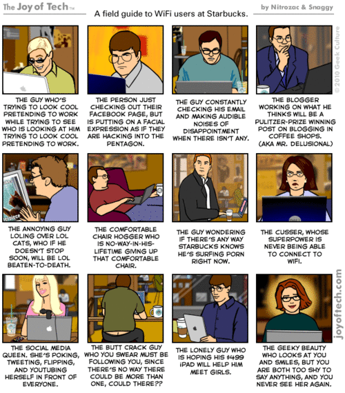 By - N3RIPosted on 16 junio, 201016 junio, 2010Posted in humor, Internet2 CommentsTipos de usuarios del wifi de Starbucks creo que he sido o conocido todos, menos «social media queen»; ¿y ustedes? Tags:humorstarbuckswifi