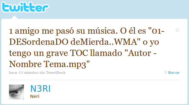 La mayoría ni siquiera tenía nombres. Tenía varios géneros mezclados (de hecho, las carpetas se llamaban «varios 1» «varios 2» y «de la radio». La palabra TRACK y PISTA aparecían por todos lados. Los primeros 20 temas de cada carpeta empezaban por «01 -« y había palabras TODO MAYÚSCULAS o «el_nombre_en_minúsculas.MP3». De los rescatablemente nombrados, había algunos que sólo tenían el nombre del tema (varios con el nombre equivocado) y otros que sólo ponían el «nombre del cantante – 0X». Sin olvidar los que tenían nombres… descriptivos: o «tema carioca.mp3″»lo bajé de taringa.wma». Había ocho «Musica Basilera.mp3» distintos, junto a otros tantos que, imagino, estaban nombrados con pequeñas diferencias para que Windows no protestara al moverlos o renombrarlos y así coexistían «Rock Nacional.mp3» «Rock Nacional .mp3» y «Rock_Nacional___.mp3». Pero peor aún son los que, teniendo nombres parecidos, son EL MISMO TEMA! Yo calculo que «Don omar – la batidora.mp3», «don omar – don omar la batidora.mp3» y «don_omar_-_la_batidora_(17).mp3» son la misma cosa, no? Pesan exactamente lo mismo y duran el mismo tiempo. ¿Y los puntos extra antes de la extensión?! ¿Por qué? ¿POR QUÉ?!? ¿POR QUÉ..mp3?»