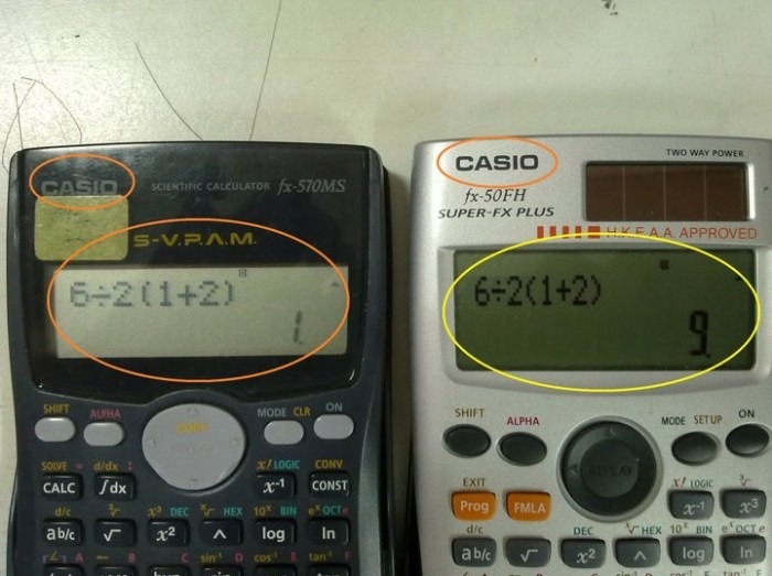 Yo tengo dos calculadoras Casio, recién lo probe, una me da 9 y la otra 1. Pensar que uno puede desaprobar un examen por una pavada como esta. Señores, a poner paréntesis 🙂