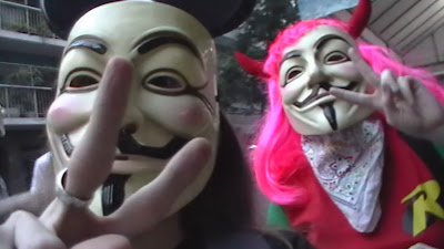 También me contaron que ellos no eran hackers, sólo gente común protestando, no me dieron bola cuando les dije que yo era del Círculo Escéptico Argentino, y no tenían (como era de esperarse) forma de contactarlos más que su página de blogspot. Todos parecían menores de edad, salvo una señora, aunque las máscaras pudieron confundirme en ese aspecto.